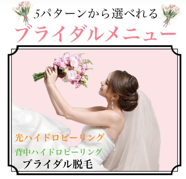 💒ブライダルメニューが登場💒 5つのプランから自分にあったお好みのメニューをお選び頂けます☺️ その後も挙式までの期間や予算に応じてお好きな回数やプランを選べれるので安心♡ 今までで一番キレイな👰♀️花嫁さん👰♀️になって頂くお手伝いを全力でさせて頂きます☺️✨ 🔸ハイドロピーリング ◆背中ハイドロピーリング 🔹ブライダル脱毛(乳輪上〜鎖骨まで・脇・二の腕・ひざ下・手の甲・手の指・肩甲骨〜うなじまで) ✨組み合わせ自由✨ 詳細はホットペッパー でご確認頂けれます😊🙏
